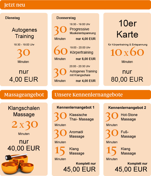 In einem von Stress, Hektik und Termindruck geprägten Alltag ist richtige Entspannung besonders wichtig. Nehmen Sie sich Zeit für sich selbst – für Ihren Körper UND Ihre Seele! Genießen Sie mit einer auf Sie zugeschnittenen Massage eine wunderbar heilsame und ganzheitliche Entspannungsreise.